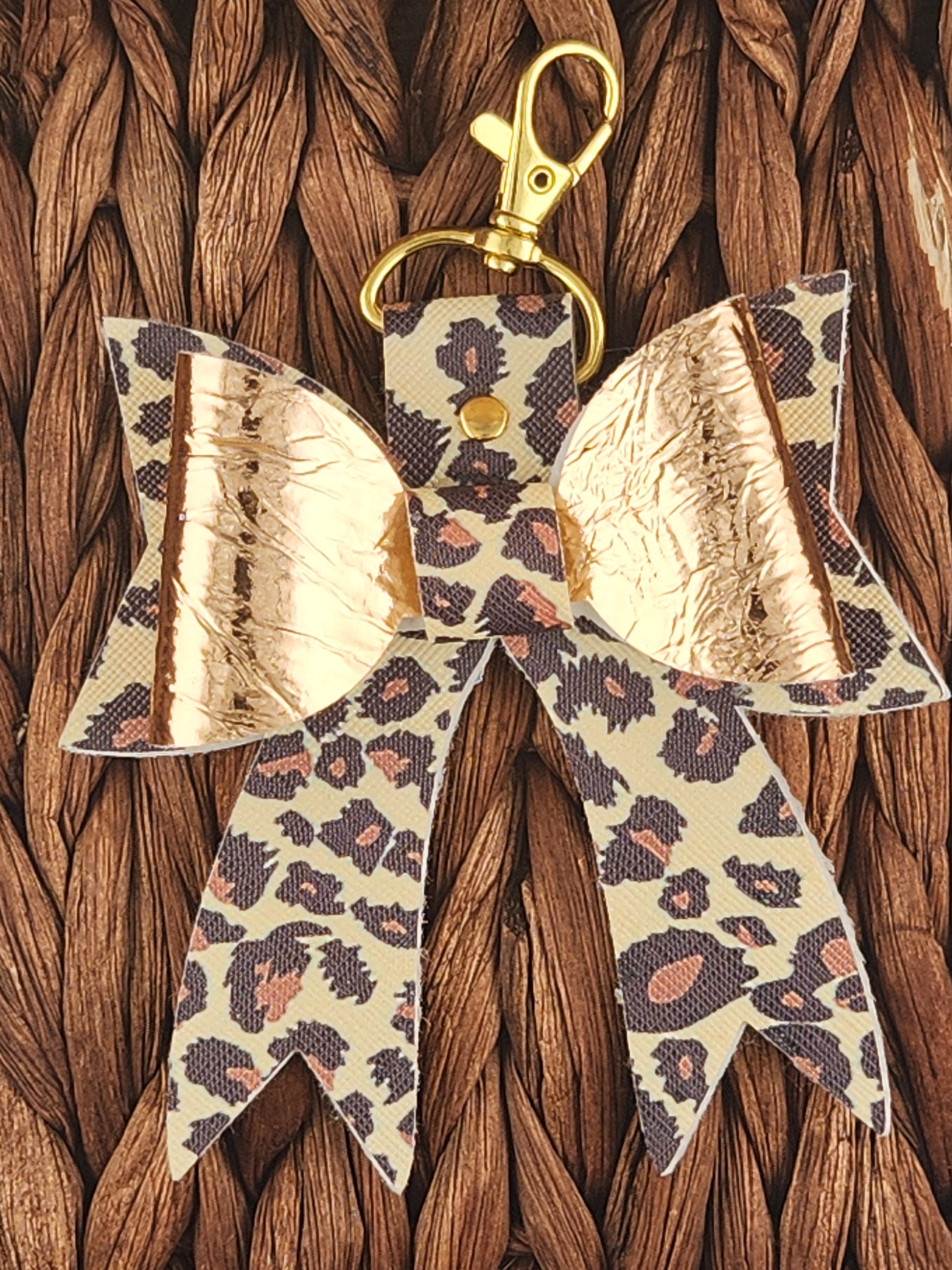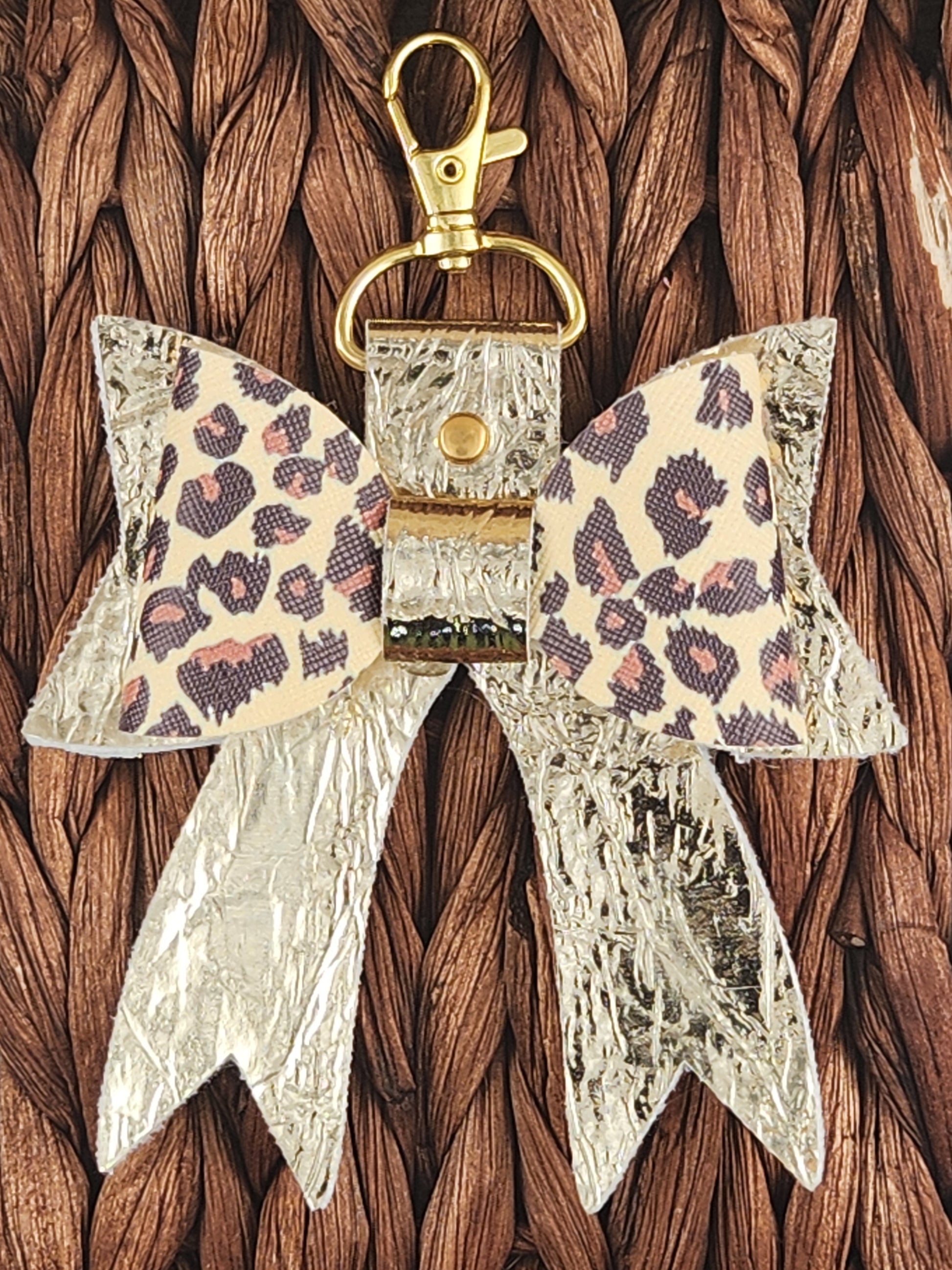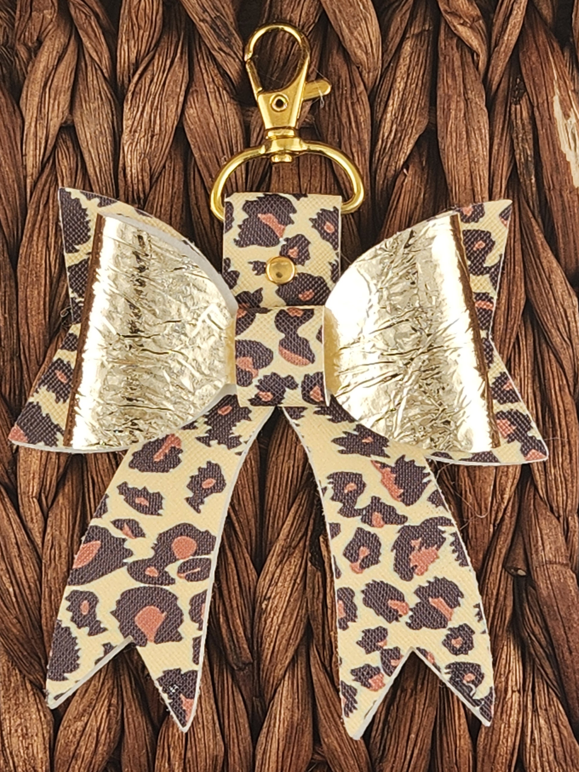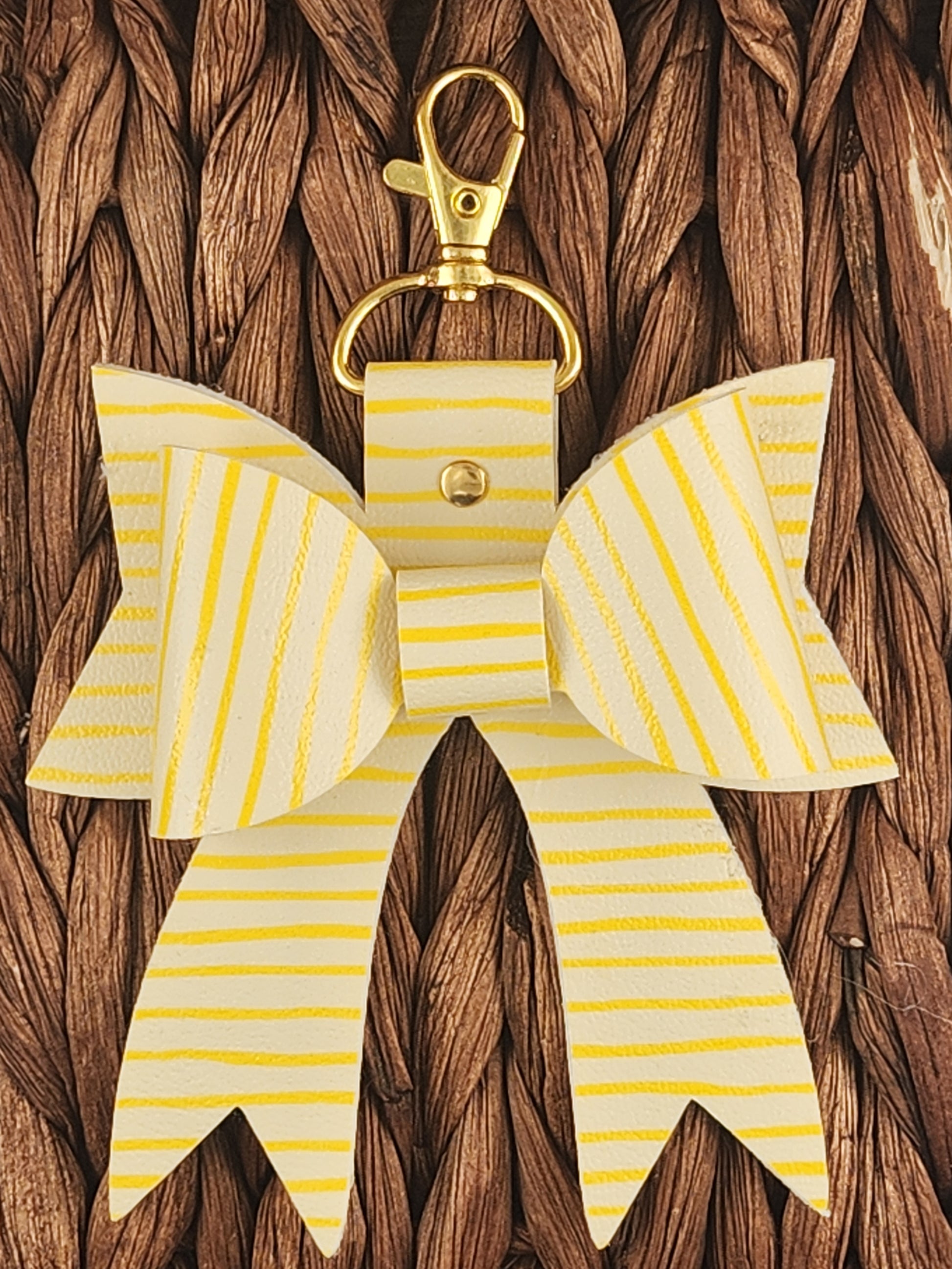 Adorable faux leather bow charm makes a perfect addition to your favorite purse. Choose from 11 different patterns. (a) Gold Bow with Leopard Print Tails (b) Rose Gold Bow with Leopard Print Tails (c) Leopard Bow with Gold Tails (d) Leopard Bow with Rose Gold Tails (e) Tan Pebble (f) Cream Smooth (g) Tan Smooth (h) Pink Smooth (i) Pink Gingham (j) Yellow Stripe (k) Black Pebble