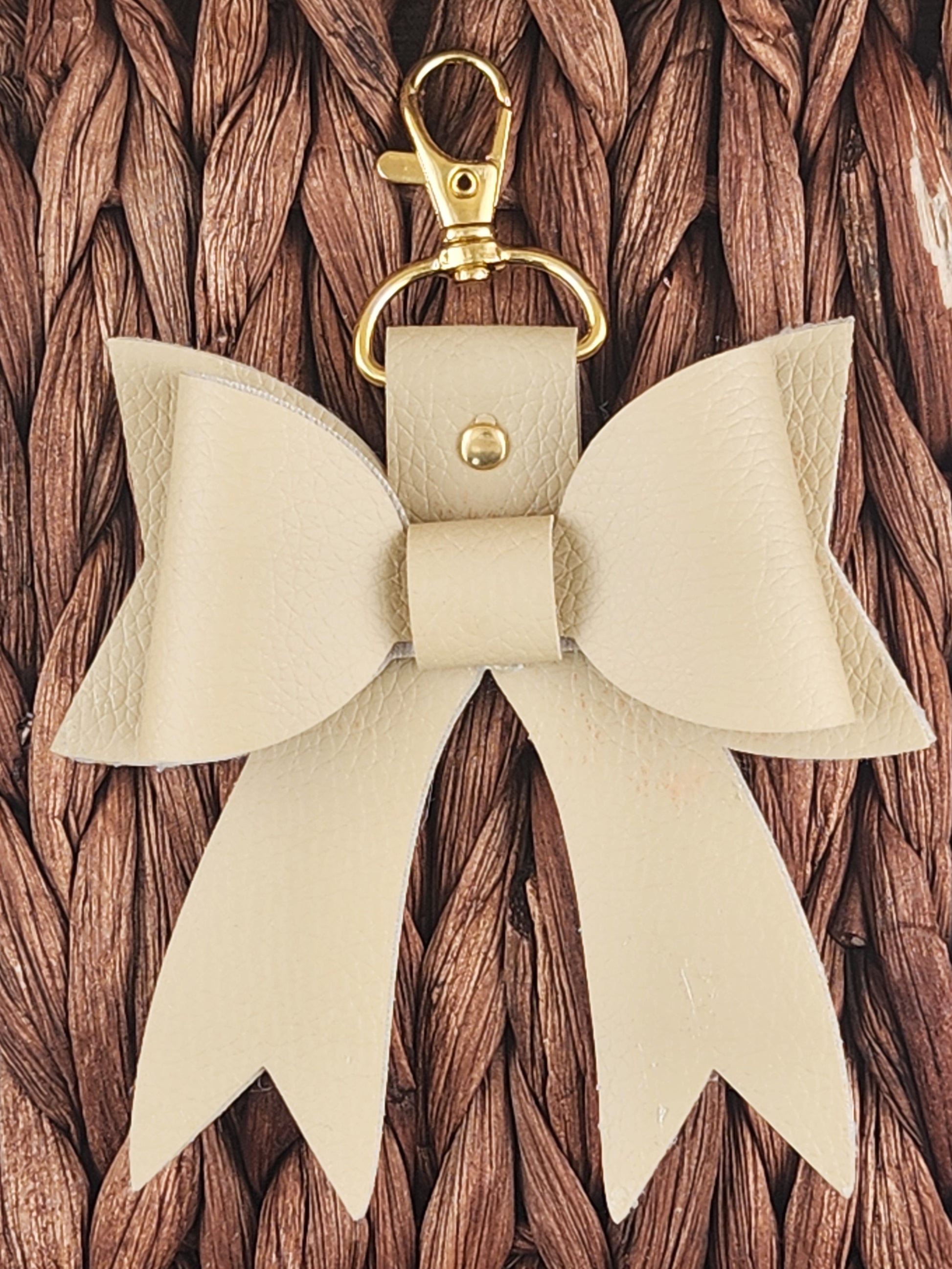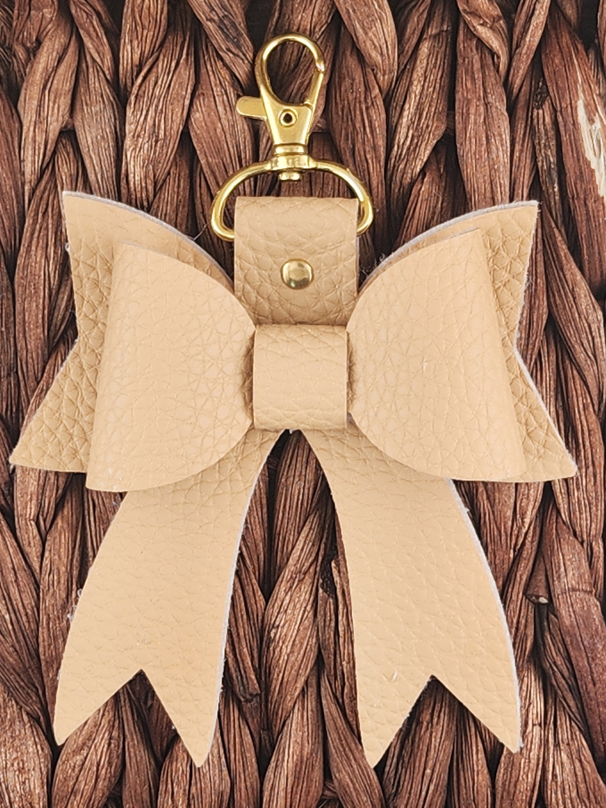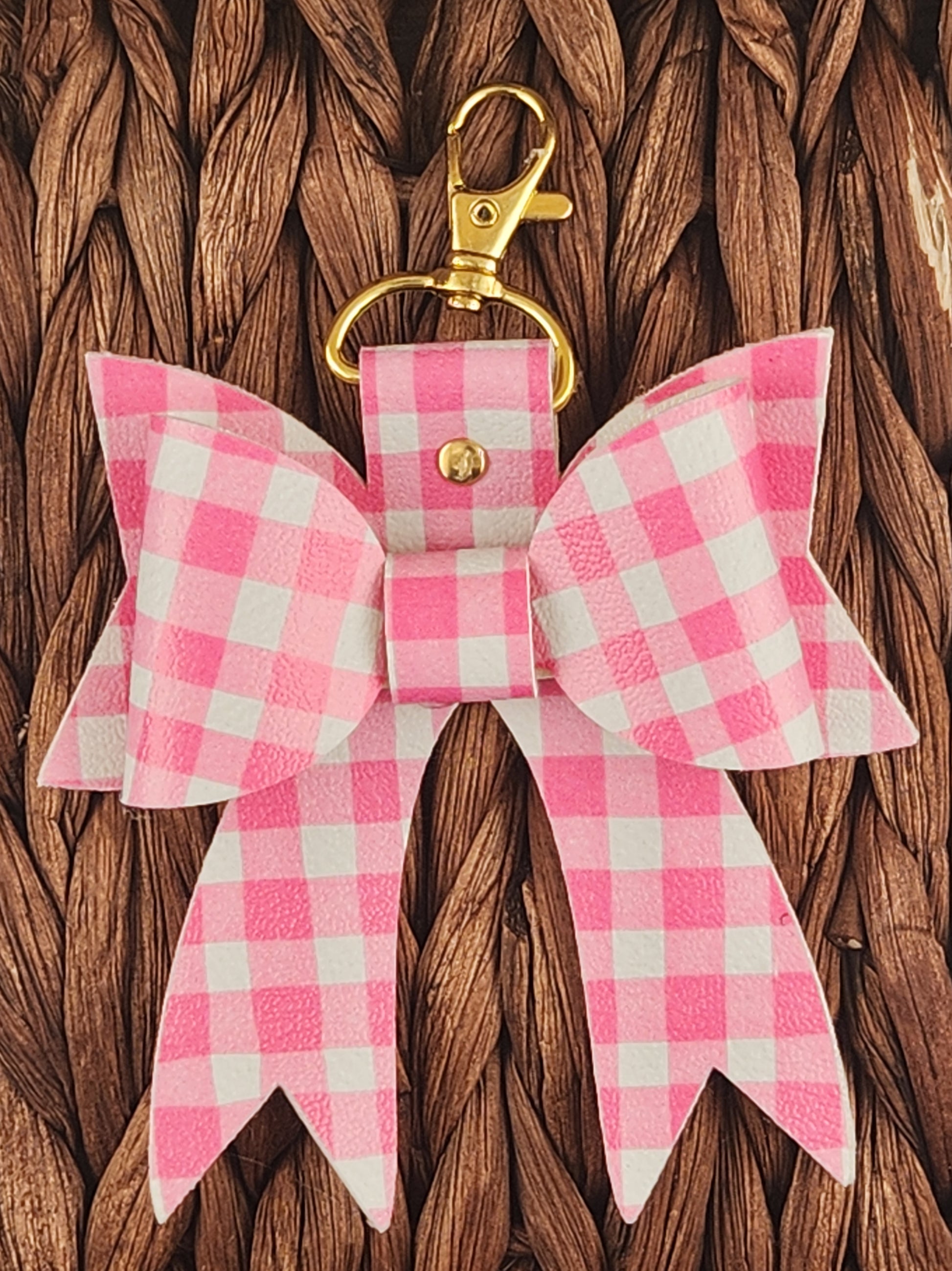 Adorable faux leather bow charm makes a perfect addition to your favorite purse. Choose from 11 different patterns. (a) Gold Bow with Leopard Print Tails (b) Rose Gold Bow with Leopard Print Tails (c) Leopard Bow with Gold Tails (d) Leopard Bow with Rose Gold Tails (e) Tan Pebble (f) Cream Smooth (g) Tan Smooth (h) Pink Smooth (i) Pink Gingham (j) Yellow Stripe (k) Black Pebble