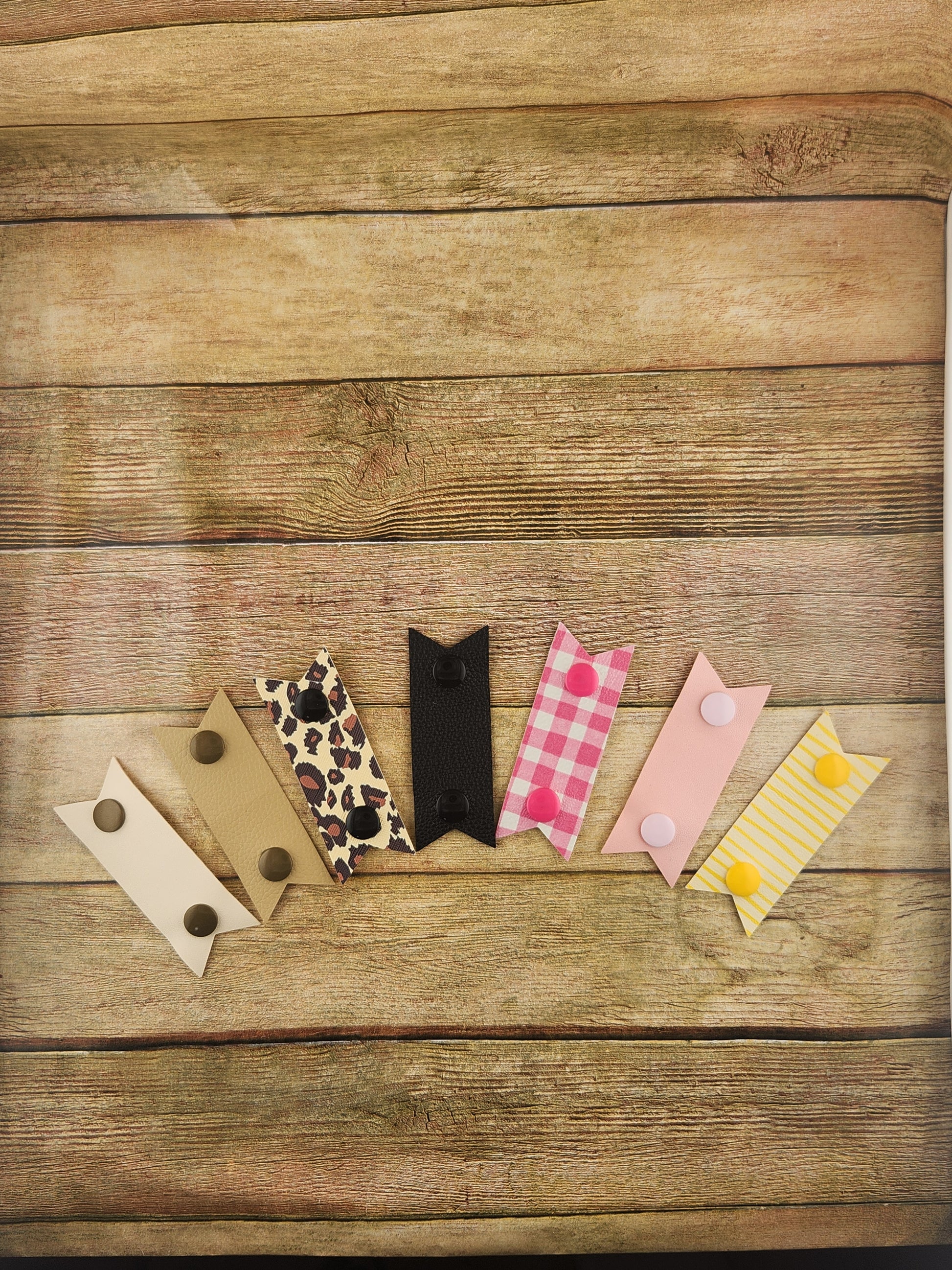 These tiny but mighty super cute cord keepers are the perfect thing to hold you phone charger, headphones, etc. They are made of faux leather and come in 7 different patterns. Please specify which pattern you would like in the notes section. (a) cream (b) tan (c) leopard print (d) black (e) pink gingham (f) pink smooth (g) yellow stripe