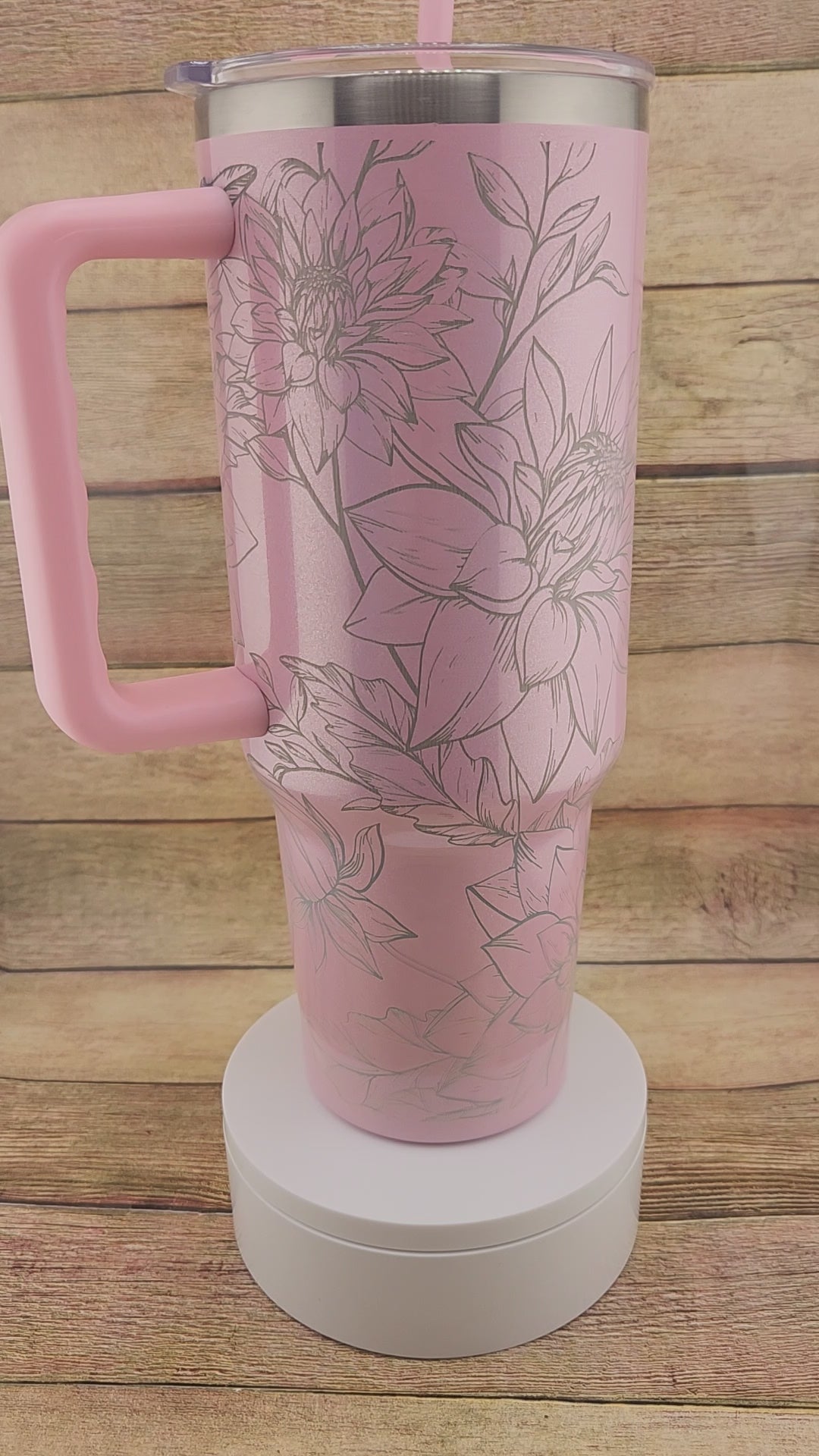 This is a beautiful iridescent pink, laser engraved 40 ounce tumbler. It is fully wrapped with a floral pattern. The video does not do it justice. It is breath taking in person.