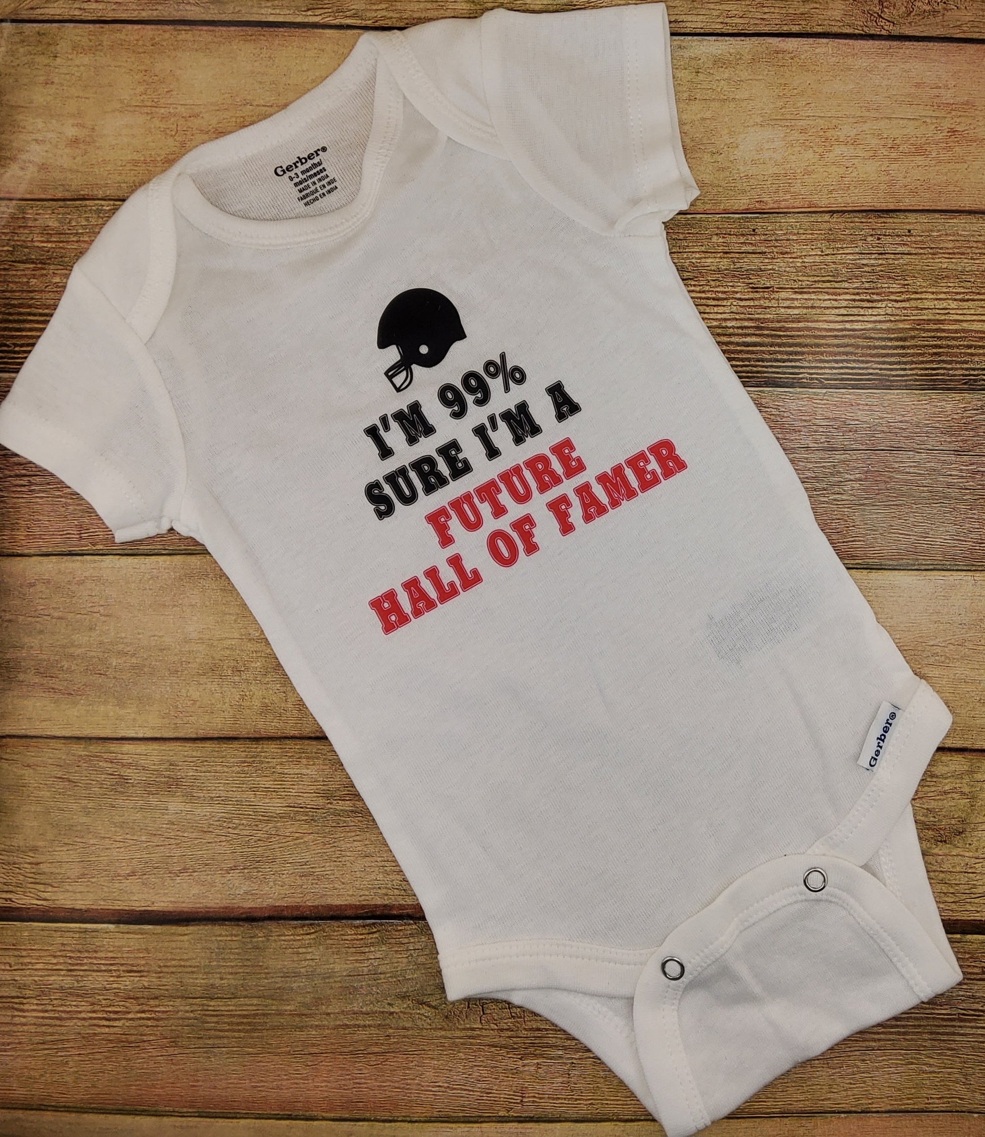 White onesie - "I'm 99% Sure I'm a Future Hall of Famer." Available in sizes 0-3 months through 18-24 months. Please give me your size in the note section at checkout.
