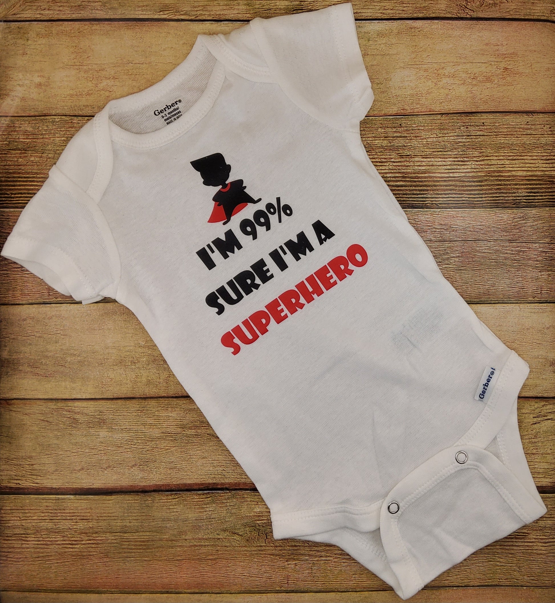 White onesie with "I'm 99% Sure I'm a Superhero." Available in sizes 0-3 months through 18-24 months. Please give me your size in the note section at checkout.