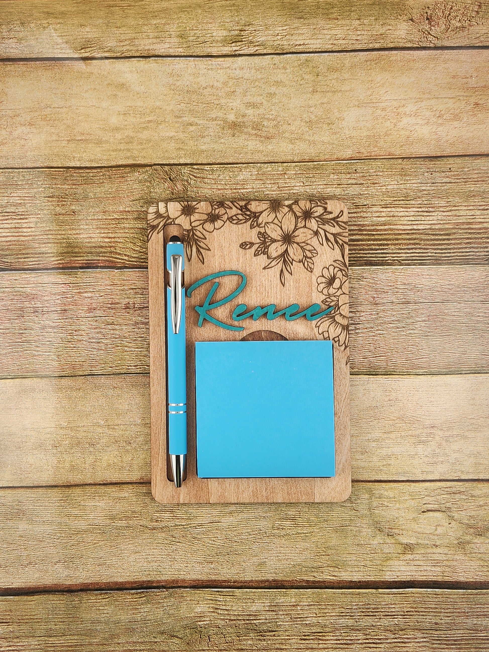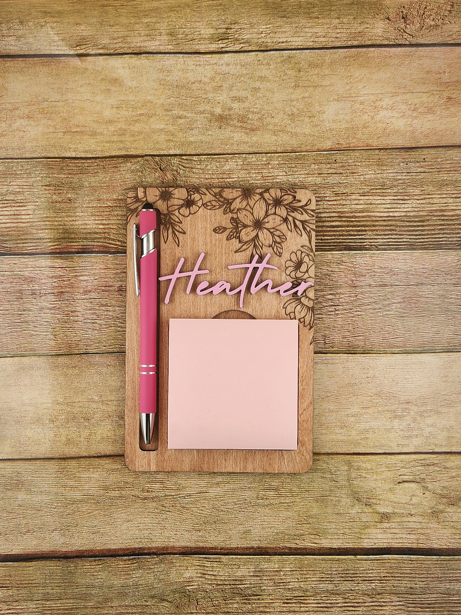 Laser engraved personalized wood sticky note and pen holder. Perfect for your desk or for mom's that make lists. Please specify in the notes section the personalization. Comes in Pink, Blue, Green, Yellow, Orange, and Purple.