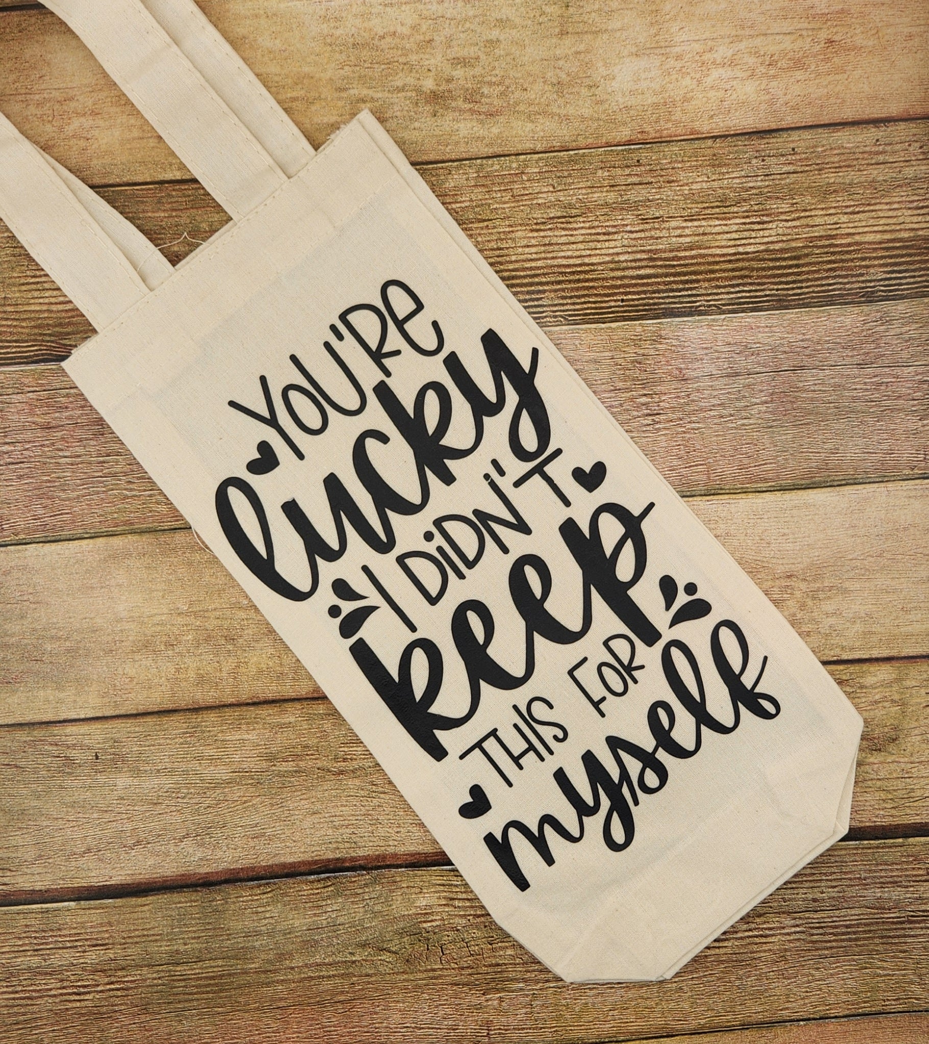 Canvas wine bag with "You're lucky I didn't keep this for myself" a perfect addition to a bottle of wine.